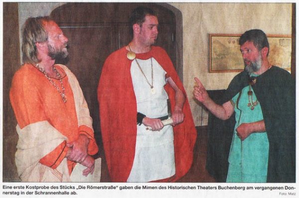 Kreisbote Mittwoch, 19. März 2008 Kempten/Buchenberg – Sein neues Stück „Die Römerstraße“ stellte das Historische Theater Buchenberg am vergangenen Donnerstag in der Schrannenhalle des Rathauses den Kemptener Stadträten vor. Hintergrund des Stücks ist der Ausbau der Römerstraße Cambodunum – Brigantium sowie die Errichtung… Weiterlesen →