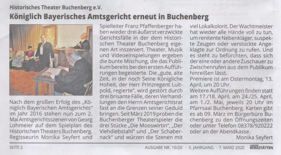 Nach dem großen Erfolg des „Königlich Bayerischen Amtsgerichts“ im Jahr 2016 stehen nun zum 2. Mal Amtsgerichtsszenen von Georg Lohmeier auf dem Spielplan des Historischen Theaters Buchenberg. Regisseurin Monika Seyfert und Spielleiter Franz Pfaffenberger haben wieder drei äußerst verzwickte Gerichtsfälle in der dem Historischen Theater Buchenberg eigenen Art inszeniert…